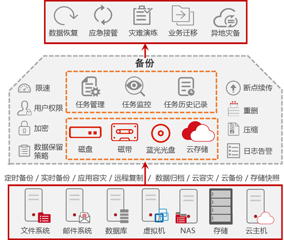 作为企业级数据保护产品,备份凭借其完善的功能与卓越的性能优势,充分满足用户在不同场景下的数据保护需求。其功能体系架构如下: